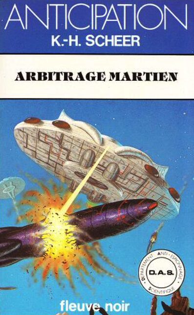 Fiche de Arbitrage martienTitre : Arbitrage martien (Tome 32 sur 42 – D.A.S. (Département Anti-espionnage Scientifique)) Première page de Arbitrage martien« — Eh bien ! qu’est-ce que je disais ! L’humanité est complètement folle ! Voici soixante-quatre croiseurs à propulsion plasmique, les produits les plus modernes qu’aient fabriqués les nations. De véritables propulseurs à haute énergie, des champs de liaison de Kohler et en outre le convertisseur de Scheuning engendrant la force motrice par fusion nucléaire selon le principe de catalyse totale du deutérium. L’allumage à l’arc à 4285 degrés Celsius suffit pour amorcer la fusion. Ainsi nous avons un jet de plasma pur et des puissances de poussée énormes grâce aux hautes densités du jet, en liaison avec des vitesses d’éjection de plus de cent mille mètres par seconde ! C’est à peu près quarante fois la puissance du propulseur de l’ancienne fusée Saturne. Par ailleurs, nos héros de l’espace possèdent des neutralisateurs d’accélération construits selon le modèle martien, ce qui leur permet d’accélérer pendant des heures à vingt g, sans avoir à craindre de problèmes de circulation, incidents cardiaques ou autres. Mère Nature a encore perdu un combat ! Des lois séculaires sont bouleversées. Et tout ça pour faire sauter la vieille planète Mars ! » Extrait de : K.H Scheer. « DAS – Arbitrage martien. » |