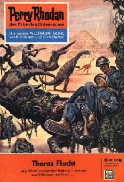 Fiche de La fuite de ThoraTitre : La fuite de Thora (Tome 13 sur 28 – Perry Rhodan #1 (La troisième force)) Première page de La fuite de Thora« Les trois monstres de métal, trois corps argentés scintillants sur le sol asiatique, pointaient vers le ciel éternellement bleu du grand continent. Leurs nez coniques semblaient renifler les étoiles. Extérieurement, ces vaisseaux spatiaux ressemblaient aux premières fusées qui avaient parcouru le chemin de la Terre vers la Lune, amorçant une nouvelle ère pour l’humanité. Mais la ressemblance était purement visuelle. Intérieurement, ces navires étaient équipés de canons radiants à longue portée et de machines qui leur permettaient de s’entourer de puissants écrans énergétiques, des boucliers protecteurs impénétrables pour toute puissance terrestre. Ceux-ci étaient des « Destroyers » dernier modèle, construits sur des proportions supérieures au précédent modèle, pouvant de plus accueillir trois hommes d’équipage et capables d’atteindre la vitesse de la lumière. » Extrait de : K.H Scheer + C. Darlton. « Perry Rhodan – La fuite de Thora. » |